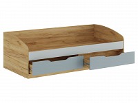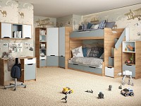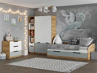 Фасады ящиков выполнены в необычном сочетании оттенков и дополнены эргономичными вырезами вместо ручек. Модель станет практичным решением для оформления детской или подростковой комнаты.