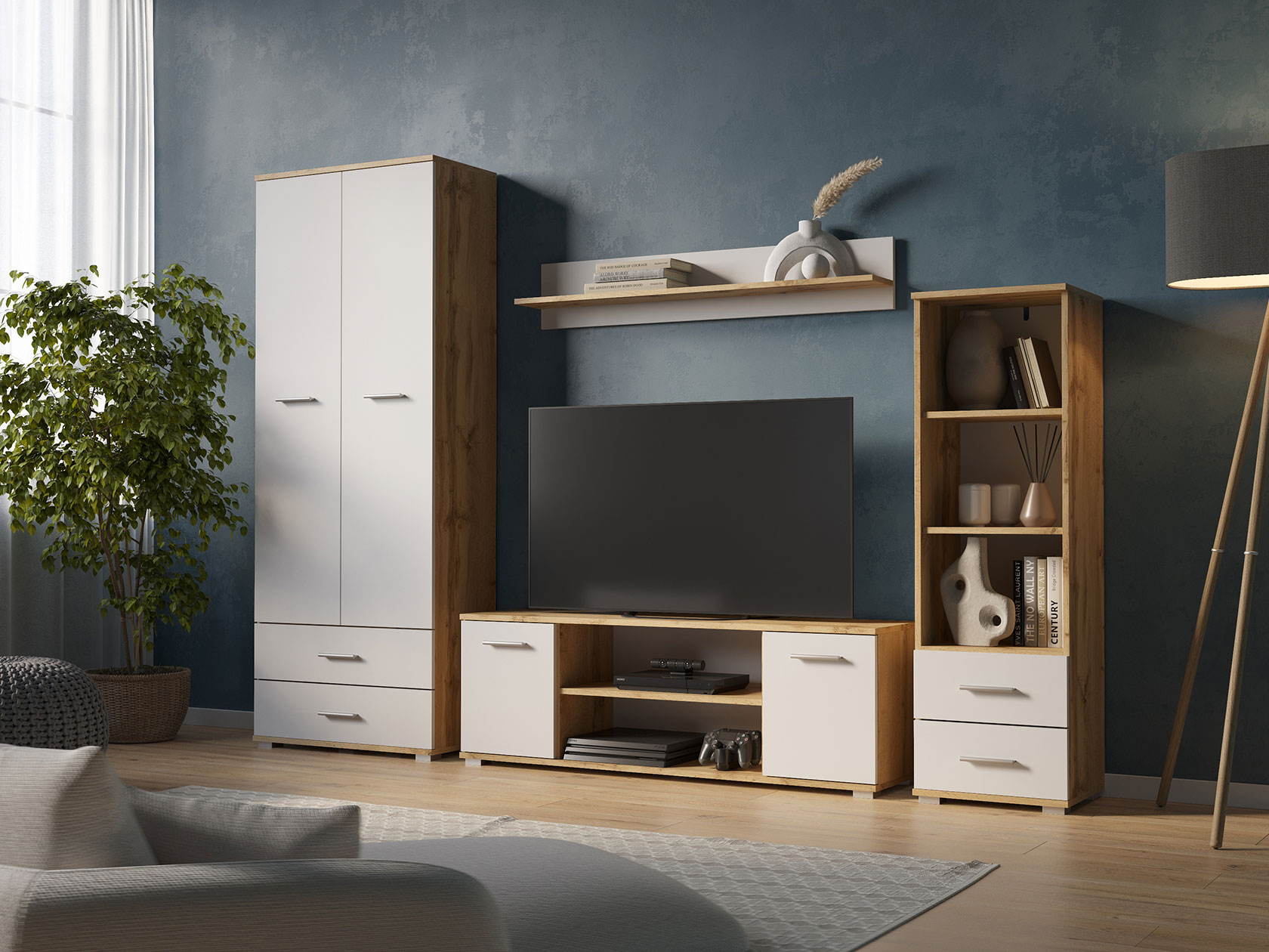 Комбинация распашных фасадов и выдвижных ящиков позволяет компактно разместить одежду, книги, ценные мелочи и предметы декора. Строгий дизайн с лаконичными ручками привлекательно смотрится в современном интерьере.
