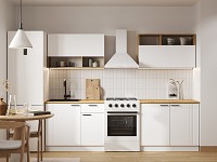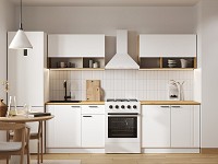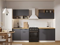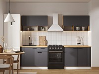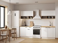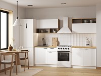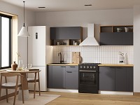 Особенность дизайна — сочетание матовых фасадов и древесной текстуры. Прямая конфигурация позволяет адаптировать мебель под небольшое пространство.