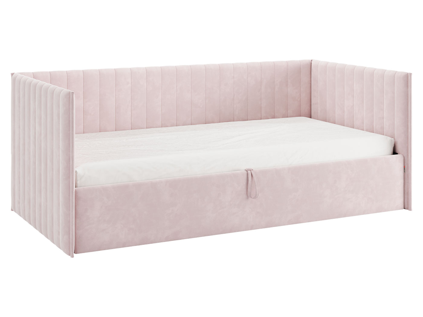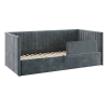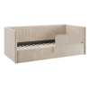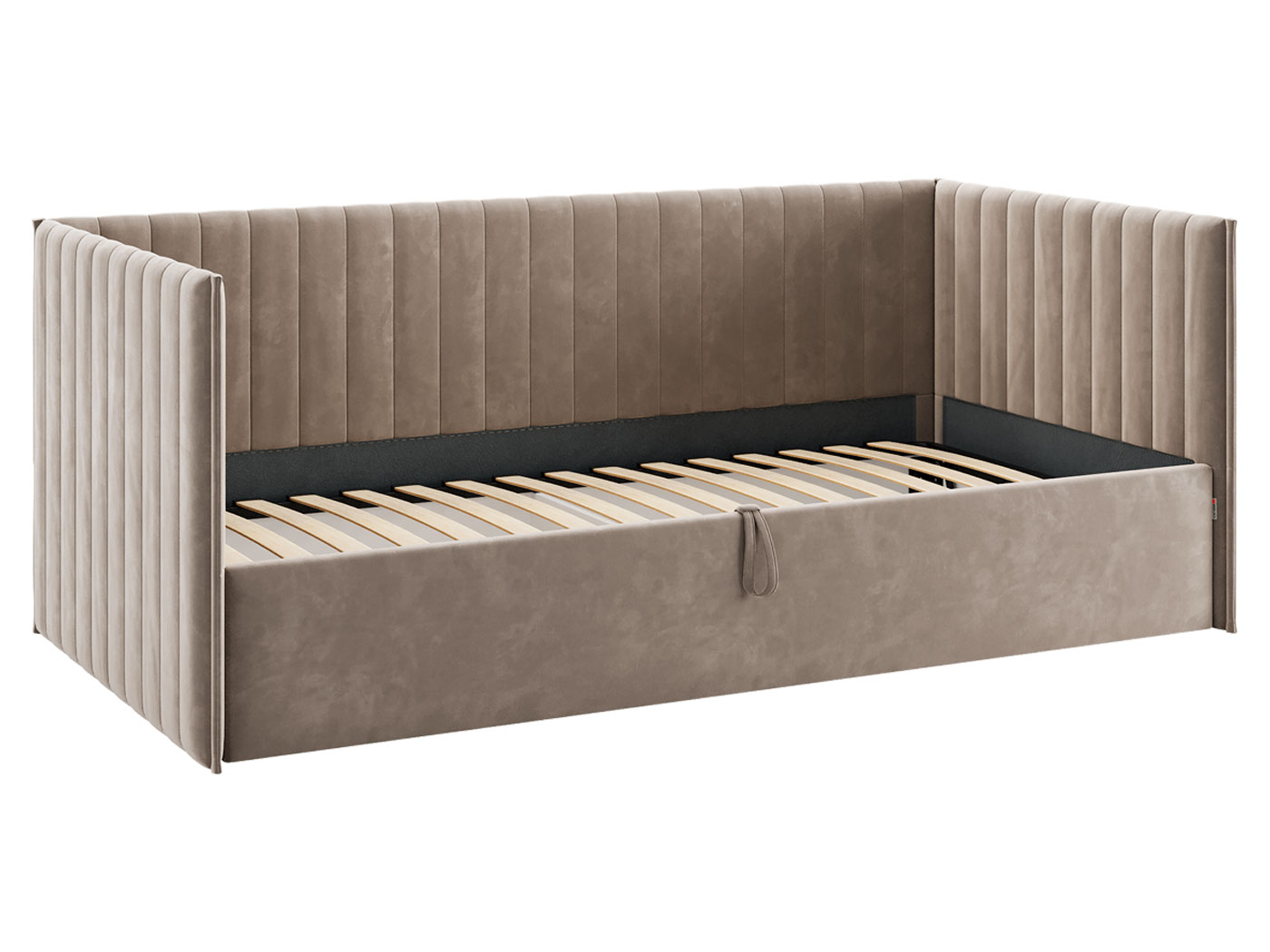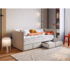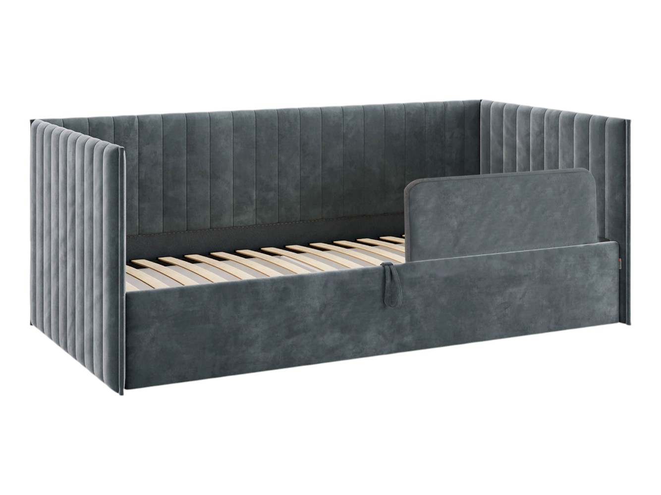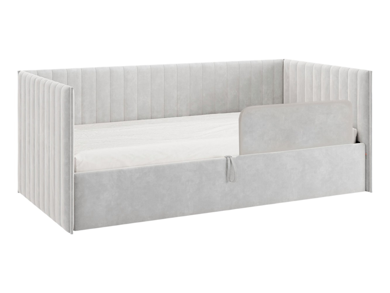 Современная модель поможет обустроить комфортный уголок для отдыха и сна. Кровать со всех сторон обита мягкой тканью, что снижает риск травмироваться об острые углы.