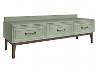 Фасады украшены фрезеровкой и дополнены изящными ручками в классическом стиле. Высокие ножки — актуальный дизайнерский прием, который придает мебели визуальную легкость. Компактные отделения создают удобную систему хранения.