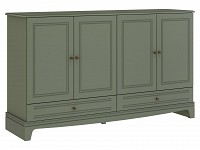 Фасады украшены фрезеровкой и лаконичными ручками, что подчеркивает элегантность модели. Качественная фурнитура обеспечивает плавный ход ящиков, а отделения за распашными дверцами позволяют удобно разложить вещи по разным категориям.