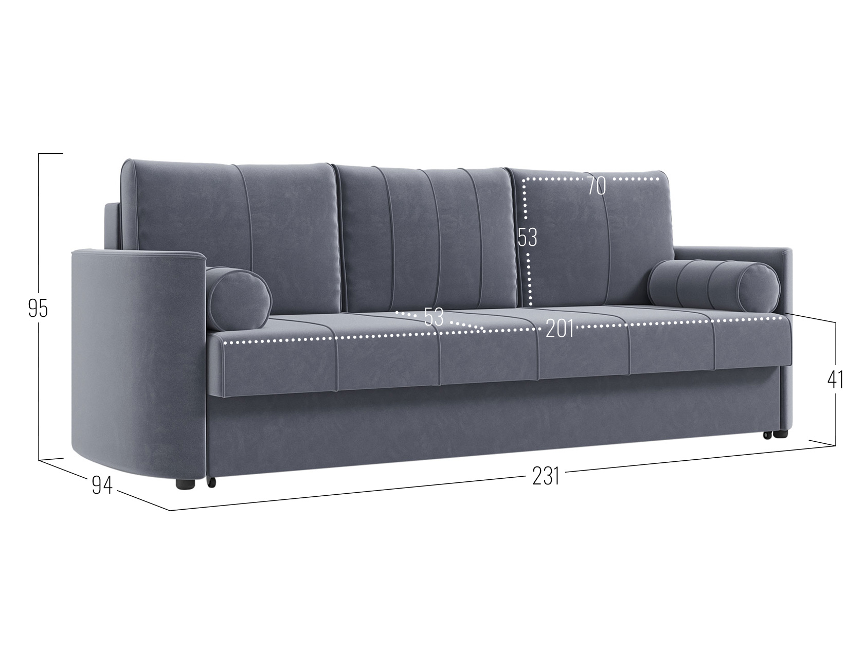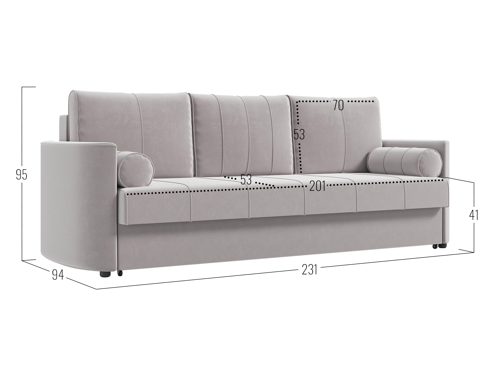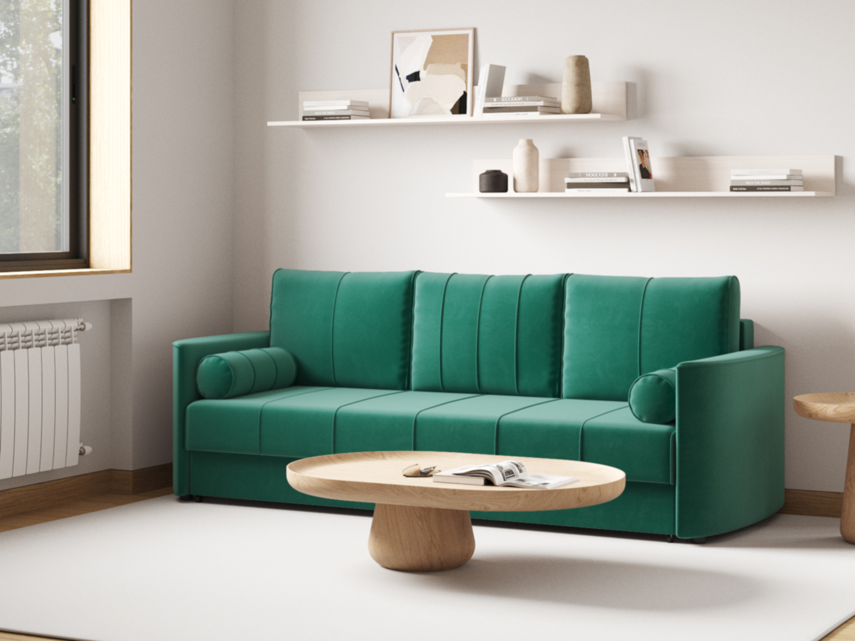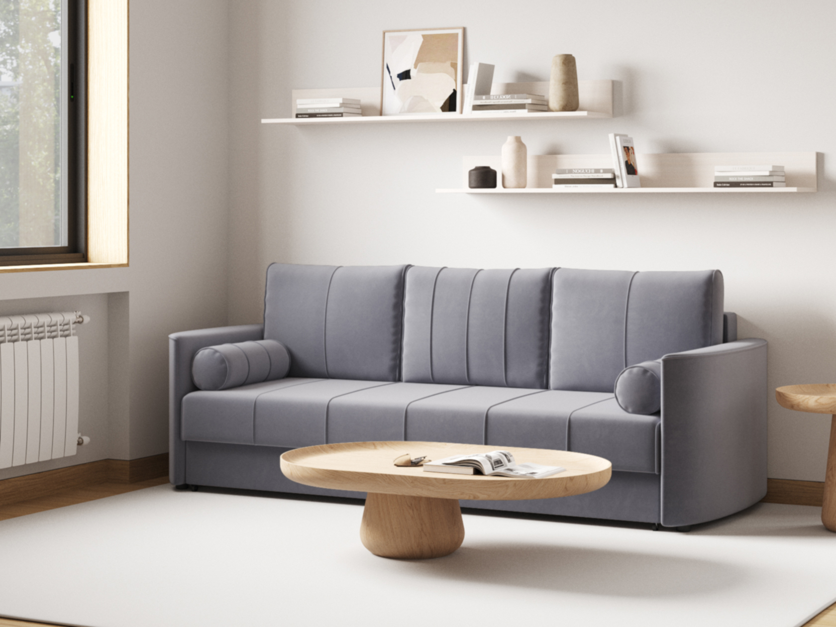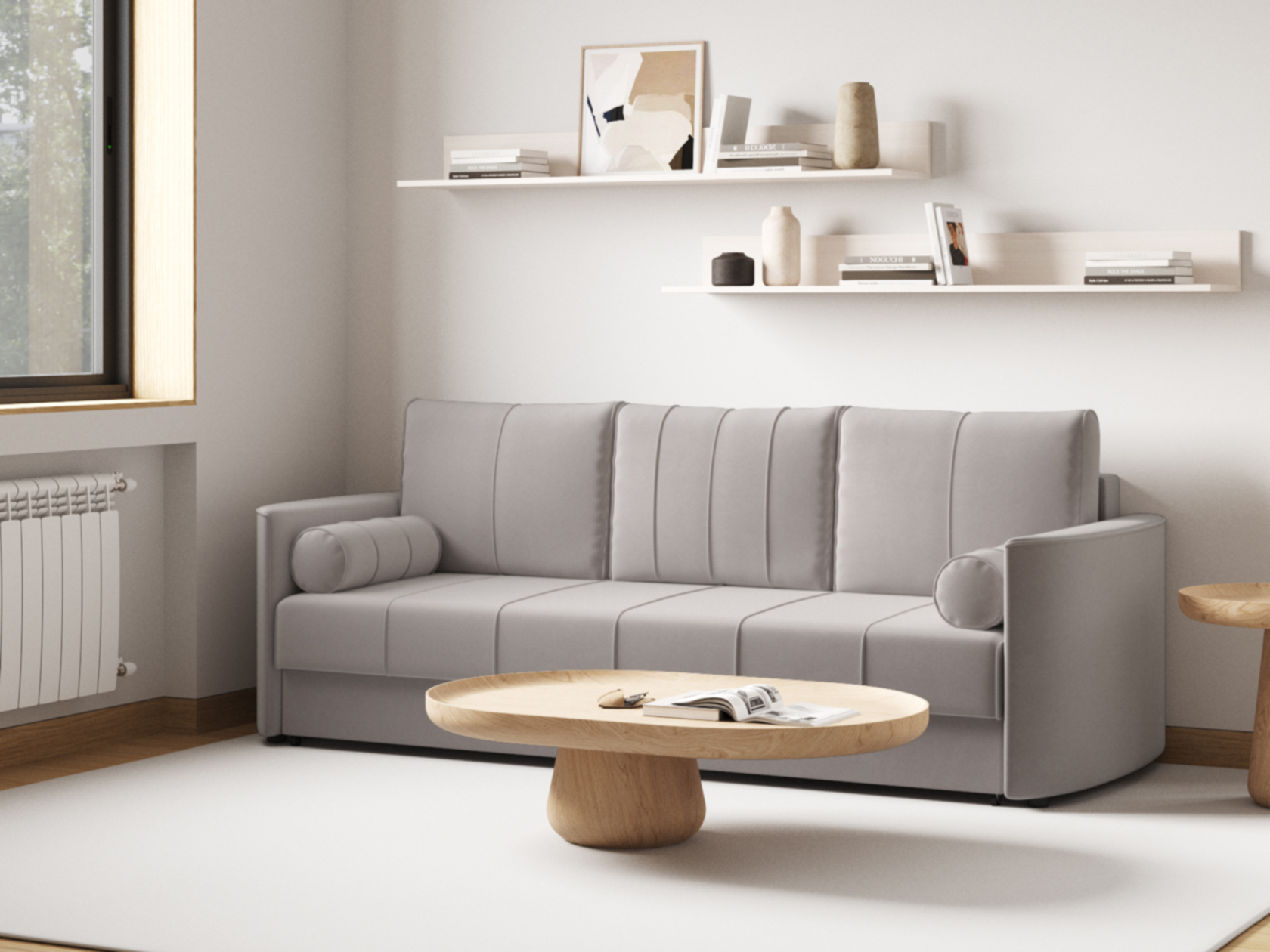 Тканевая обивка со всех сторон позволяет установить модель в любой части комнаты. Удобный механизм трансформации легко превращает диван в спальное место. Под сиденьем расположен бельевой короб. Это решение помогает рационально организовать пространство и хранить постельные принадлежности. Декоративная строчка в виде ровных линий на обивке и подушках гармонично сочетается с закругленными подлокотниками, подчеркивая аккуратный облик модели.