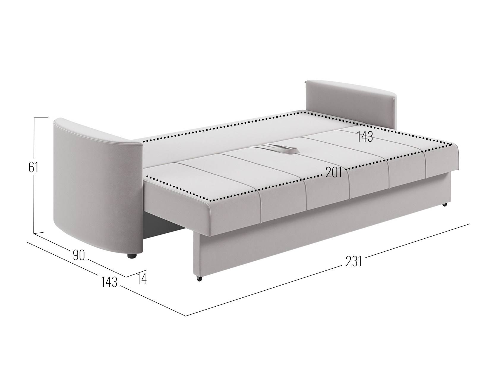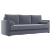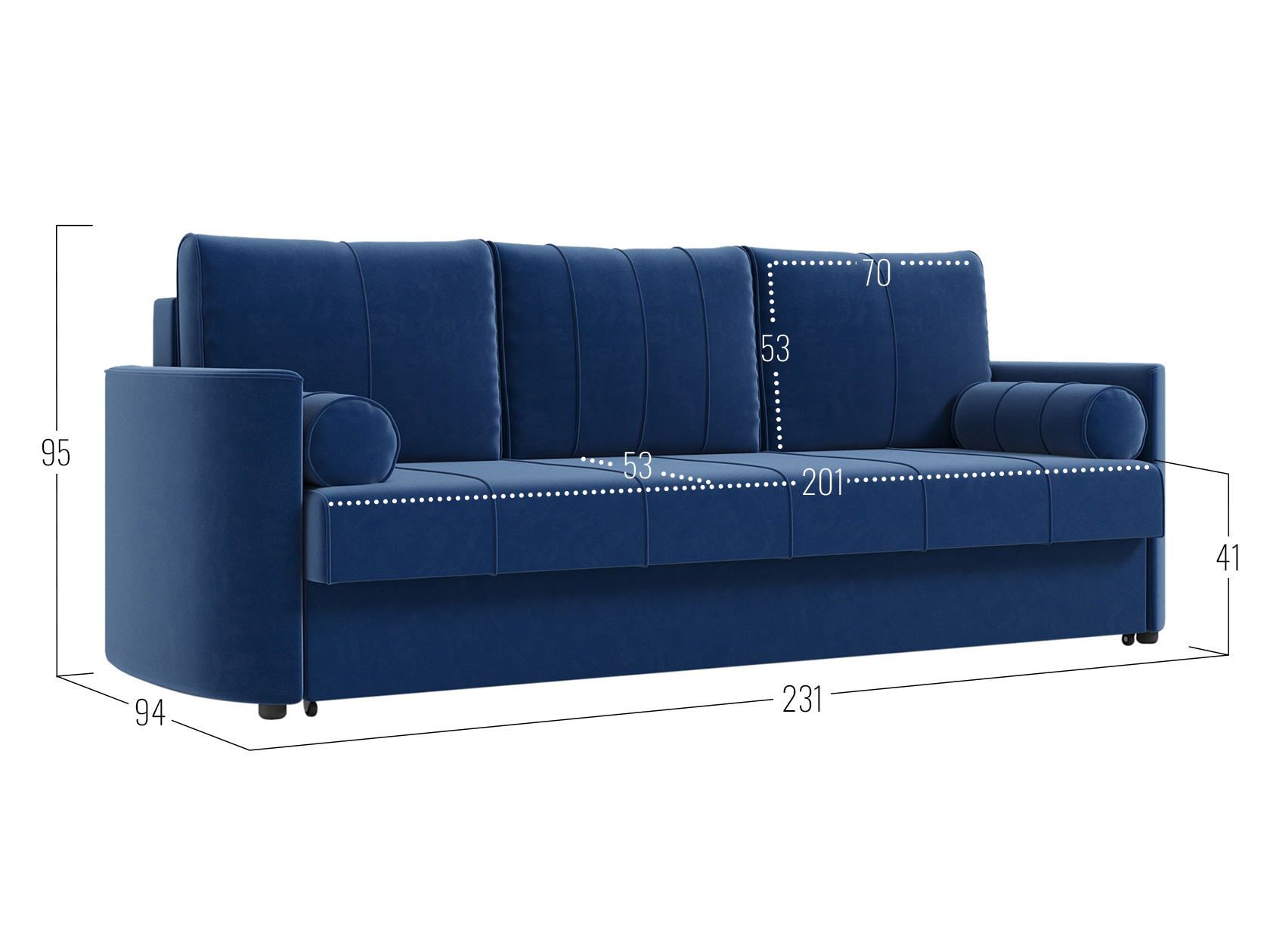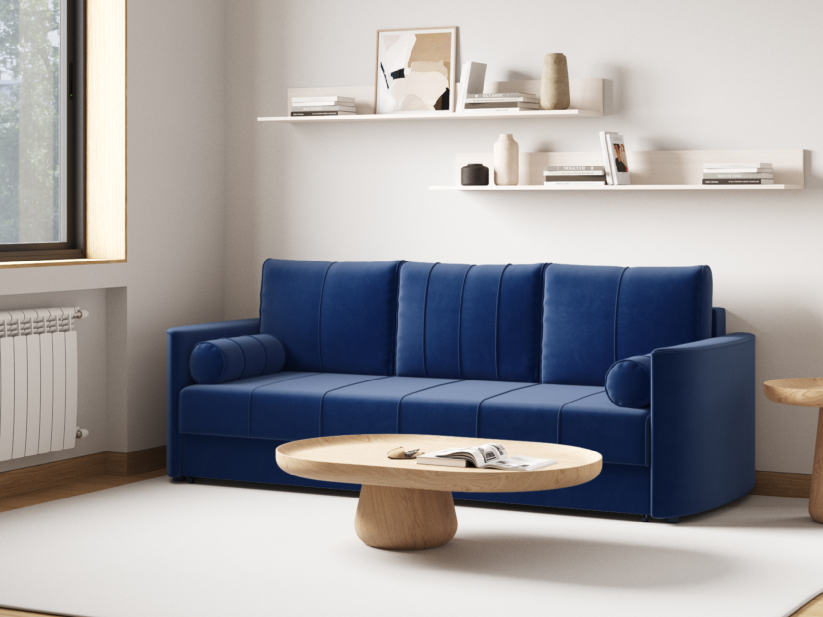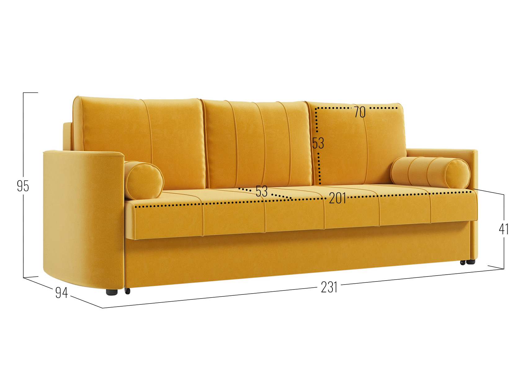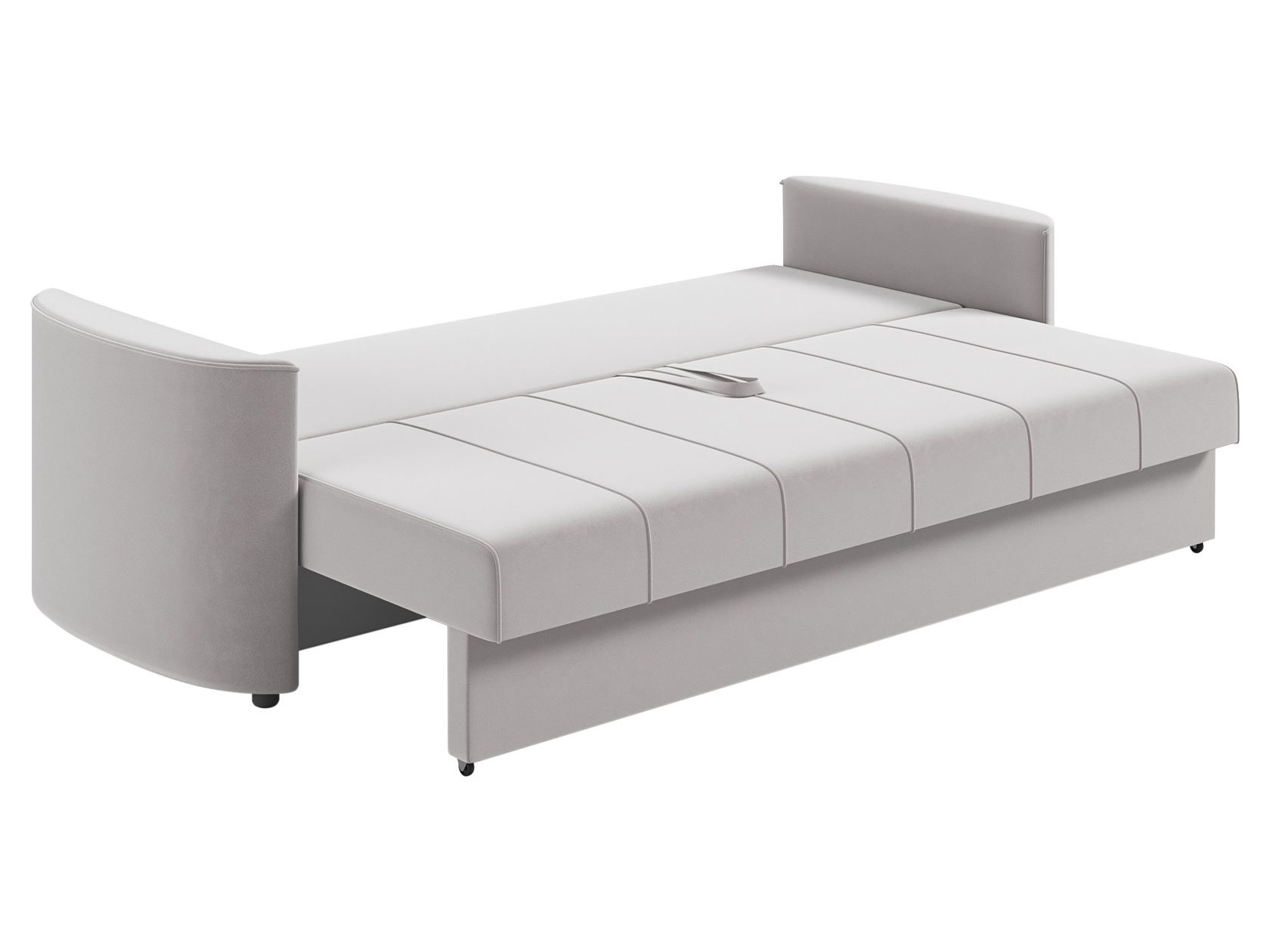 Тканевая обивка со всех сторон позволяет установить модель в любой части комнаты. Удобный механизм трансформации легко превращает диван в спальное место. Под сиденьем расположен бельевой короб. Это решение помогает рационально организовать пространство и хранить постельные принадлежности. Декоративная строчка в виде ровных линий на обивке и подушках гармонично сочетается с закругленными подлокотниками, подчеркивая аккуратный облик модели.