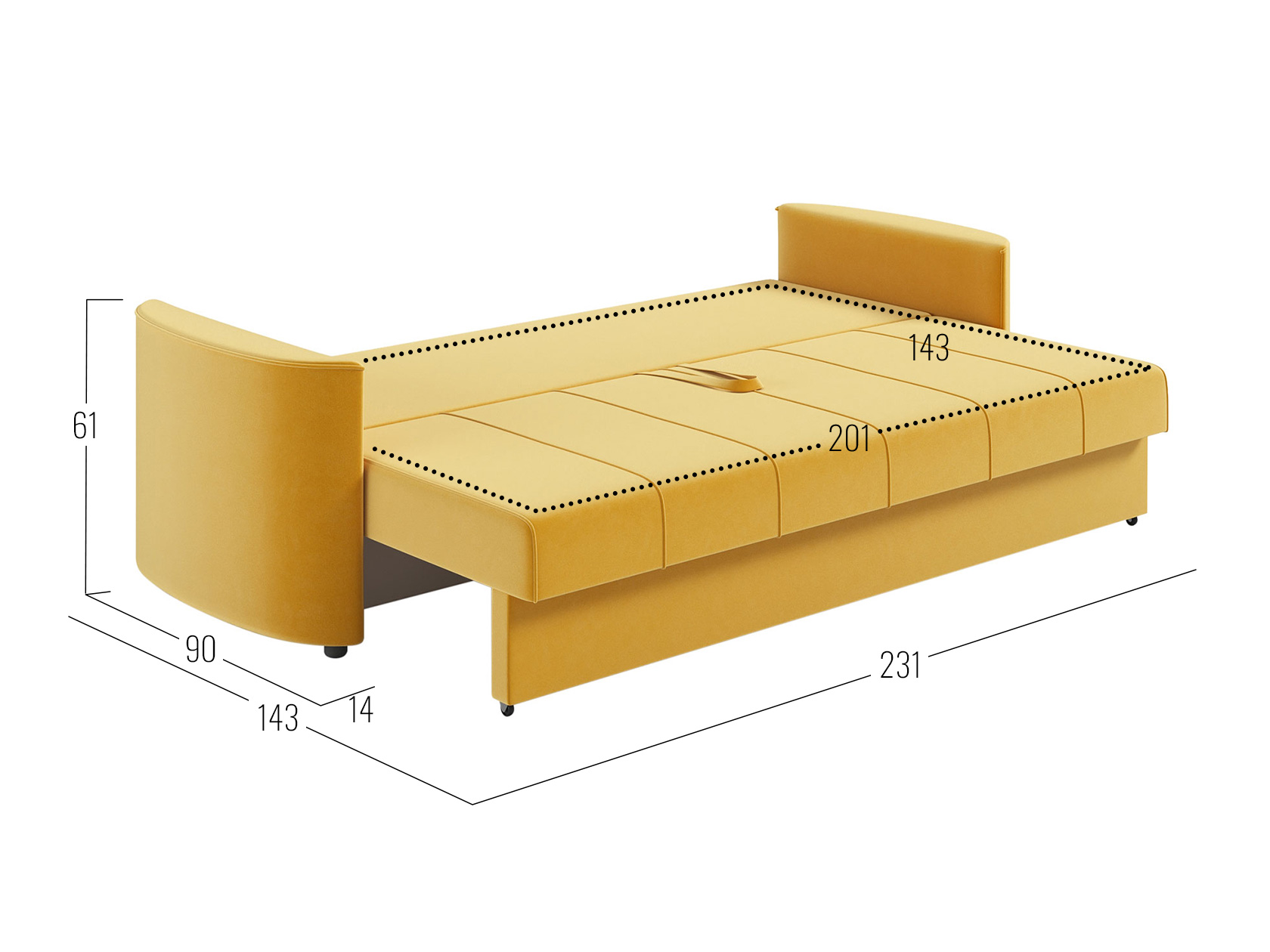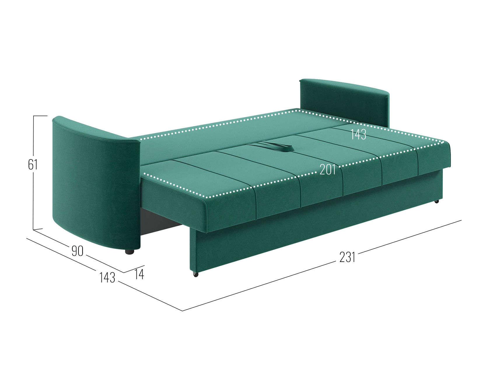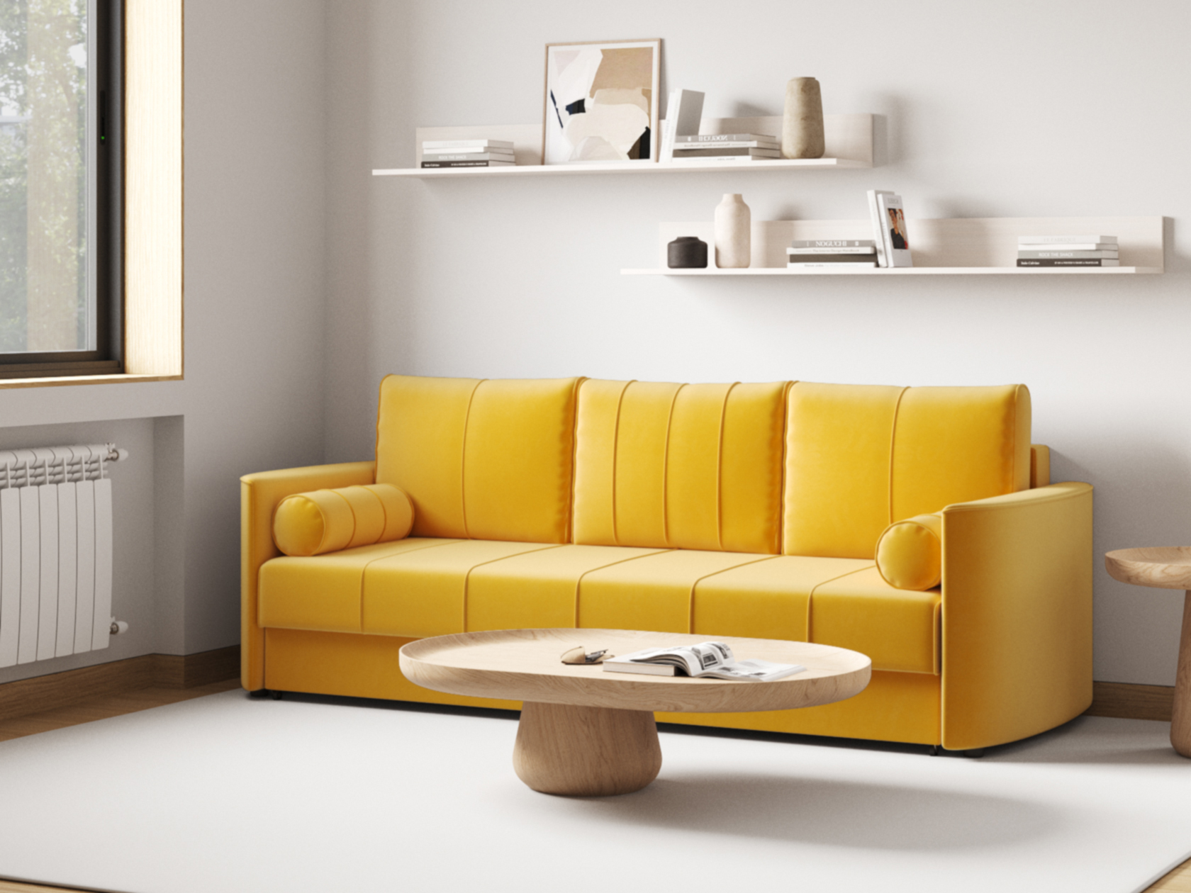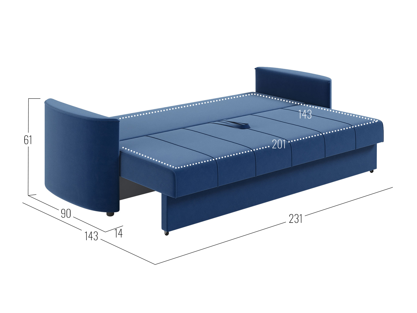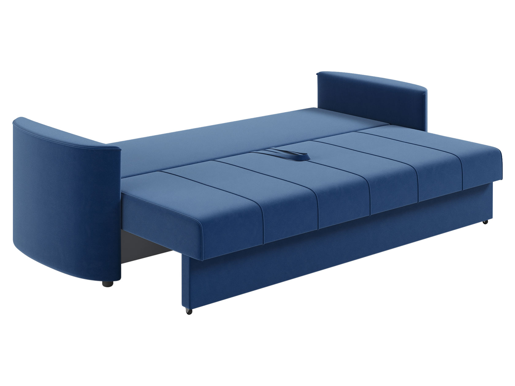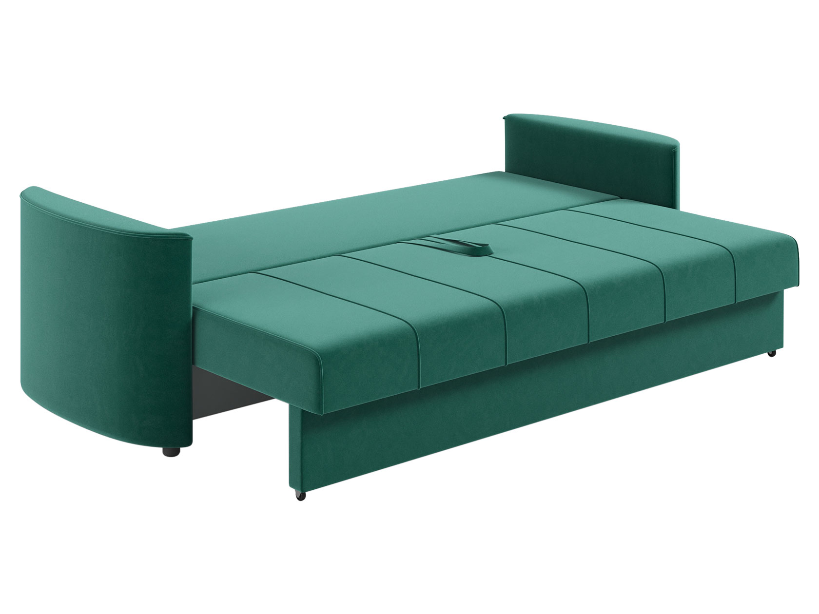 Тканевая обивка со всех сторон позволяет установить модель в любой части комнаты. Удобный механизм трансформации легко превращает диван в спальное место. Под сиденьем расположен бельевой короб. Это решение помогает рационально организовать пространство и хранить постельные принадлежности. Декоративная строчка в виде ровных линий на обивке и подушках гармонично сочетается с закругленными подлокотниками, подчеркивая аккуратный облик модели.