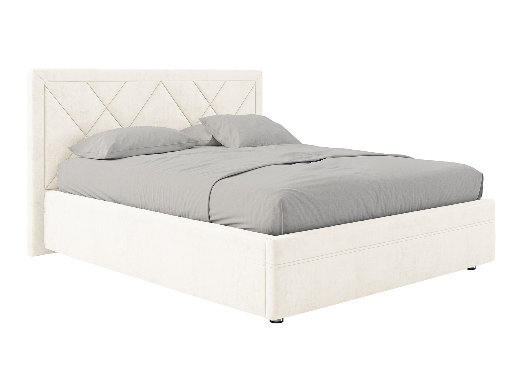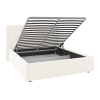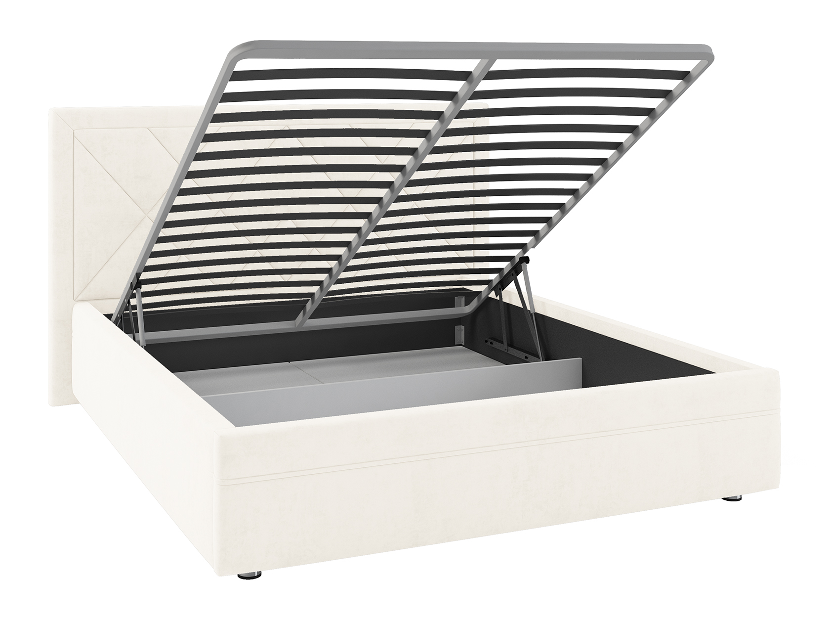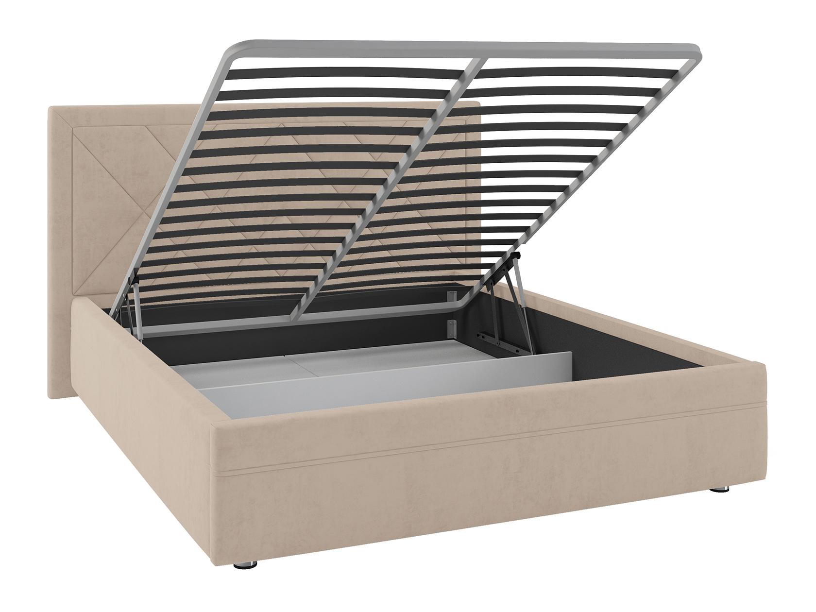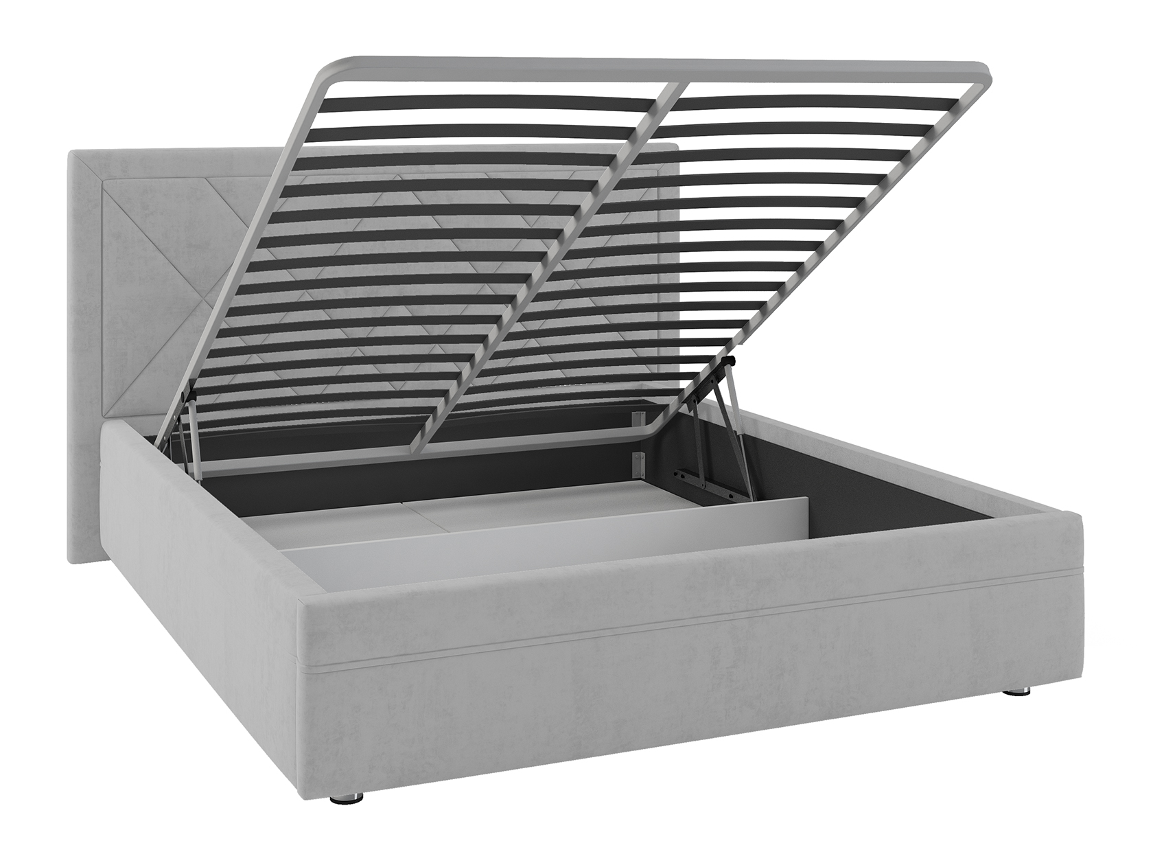 Благодаря мягкой обивке модель смотрится очень уютно и располагает к отдыху, а декоративная строчка выступает интересным акцентом изголовья. Основание с гибкими ламелями легко поднимается, открывая доступ к ящику для белья. Внутри удобно хранить постельные принадлежности, теплые пледы или сезонные вещи.